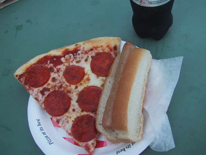 Pizza and a hot dog for dinner. The dog was better than the pizza.